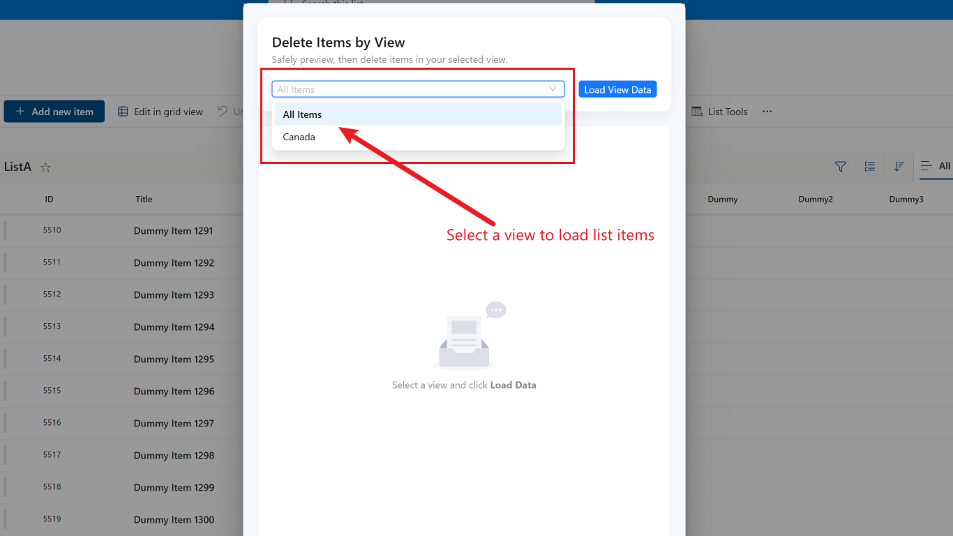 The Batch Delete tool is integrated with SharePoint list views. In this step, you select an existing view from the dropdown list. The tool will load all the items that match the filters and conditions of that specific view. This allows you to precisely target which items you want to delete.